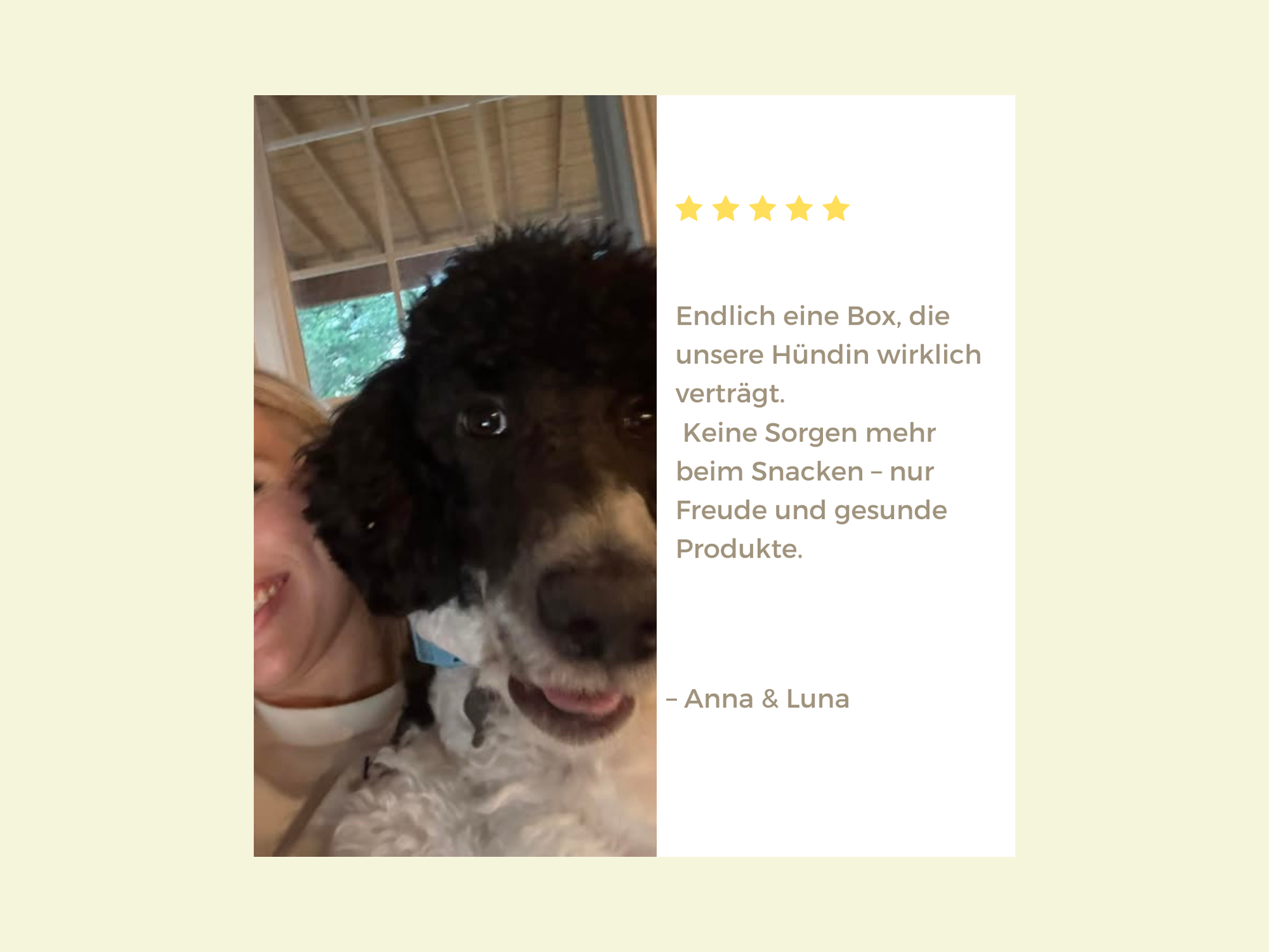 "Unser Schäferhund Bruno war schon immer ein wählerischer Esser. Seit wir die Original Box haben, freut er sich jeden Monat wie verrückt auf seine Überraschung. Die Qualität ist unglaublich!"