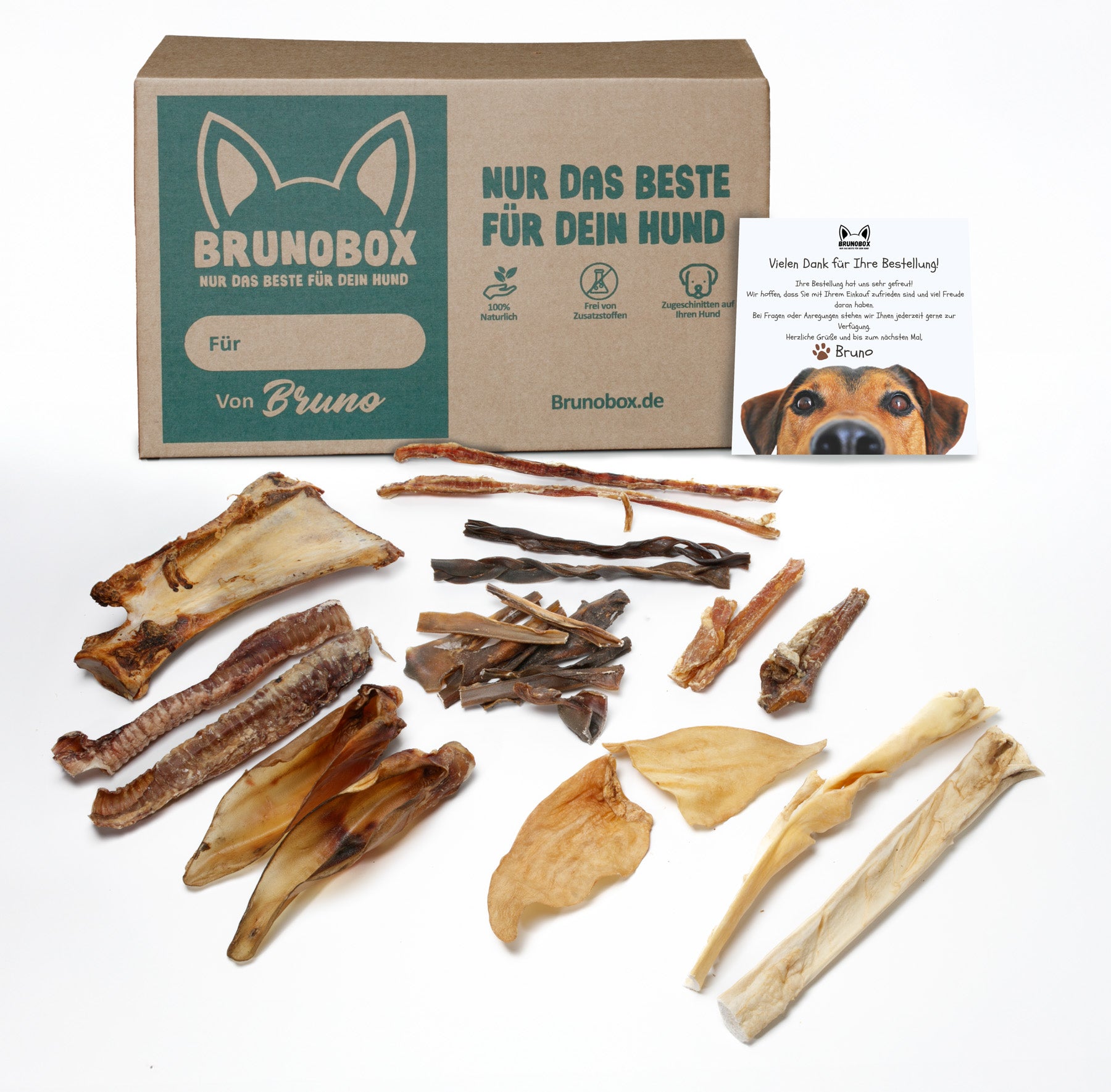Die Premium Box ist für Hunde mit starkem Kaubedürfnis. Während die Original Box ein Spielzeug und weichere Snacks enthält, bekommst du hier nur extra harte Kauartikel aus 100% natürlichen Zutaten. Perfekt für Power-Kauer!