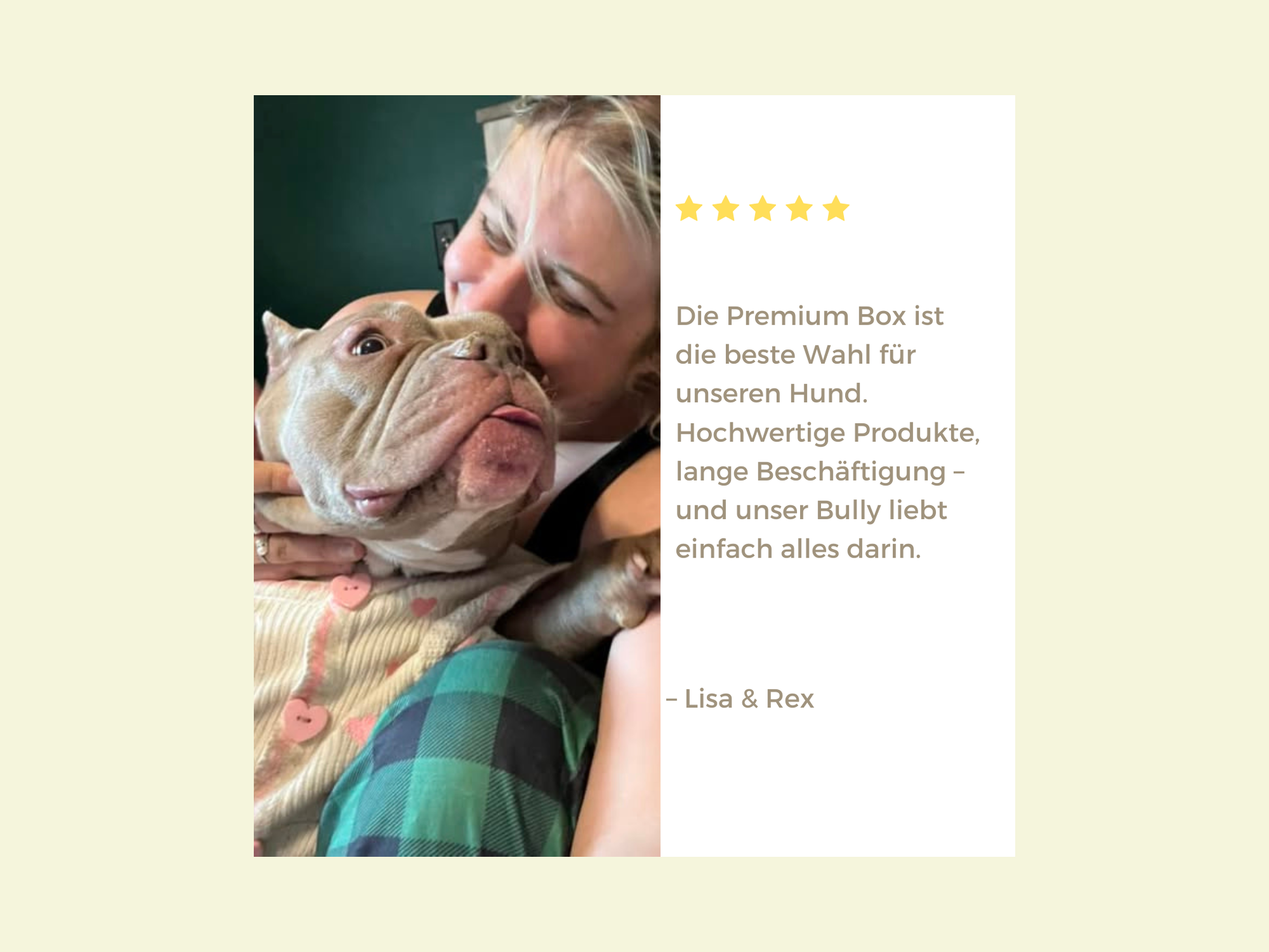 "Endlich eine Box, die zu unserem Budget passt UND hochwertig ist. Meine Labradorhündin liebt besonders die Schweineohren. Das Spielzeug wechselt jeden Monat – perfekt!"